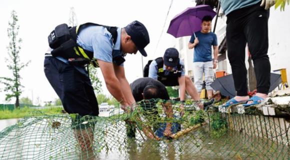7月12日,江苏省南京市公安局建邺分局民警帮助群众修理抽水泵,及时疏导积水。 国武 摄