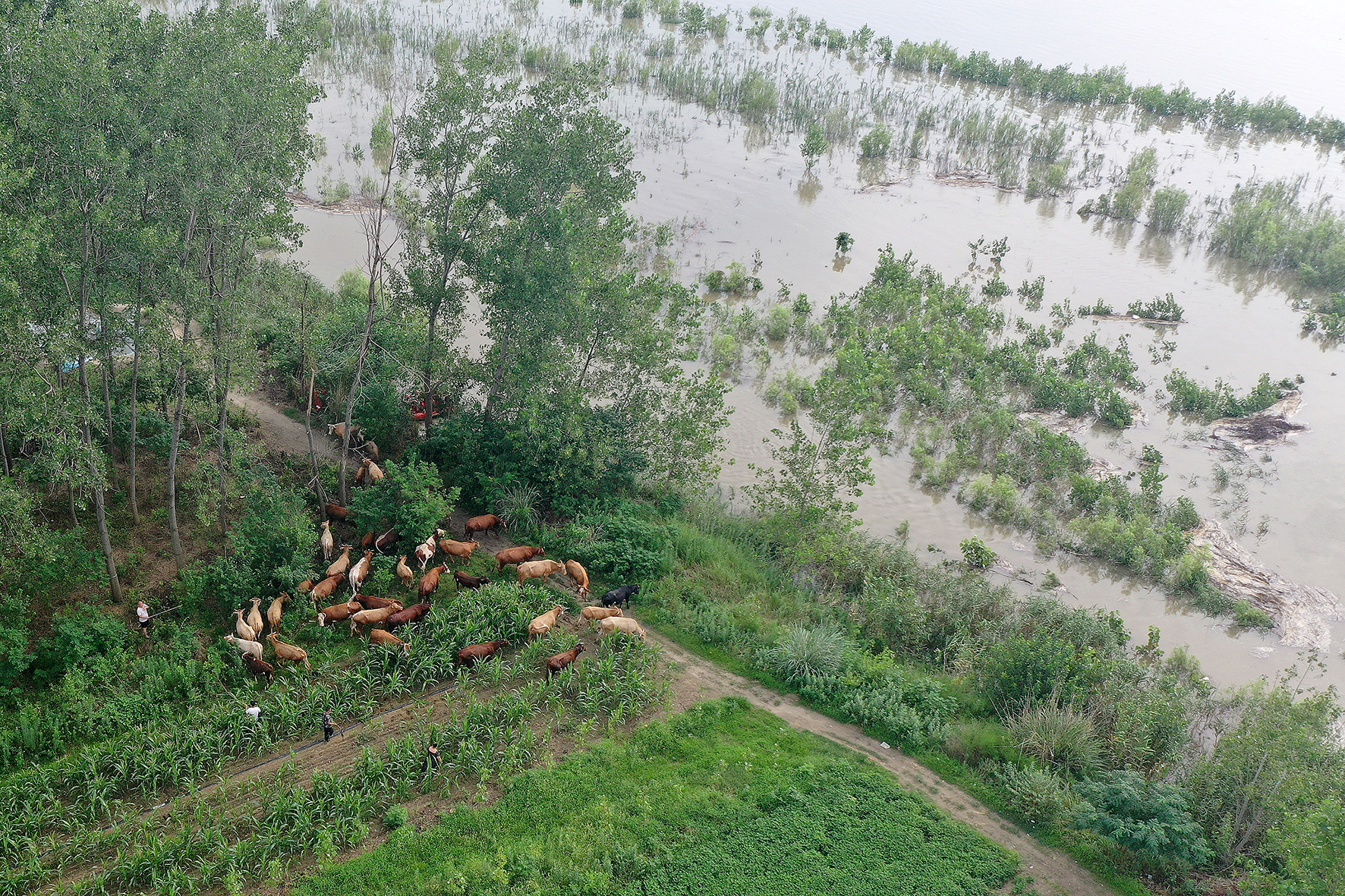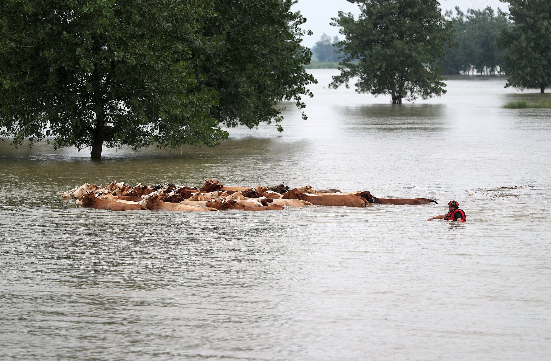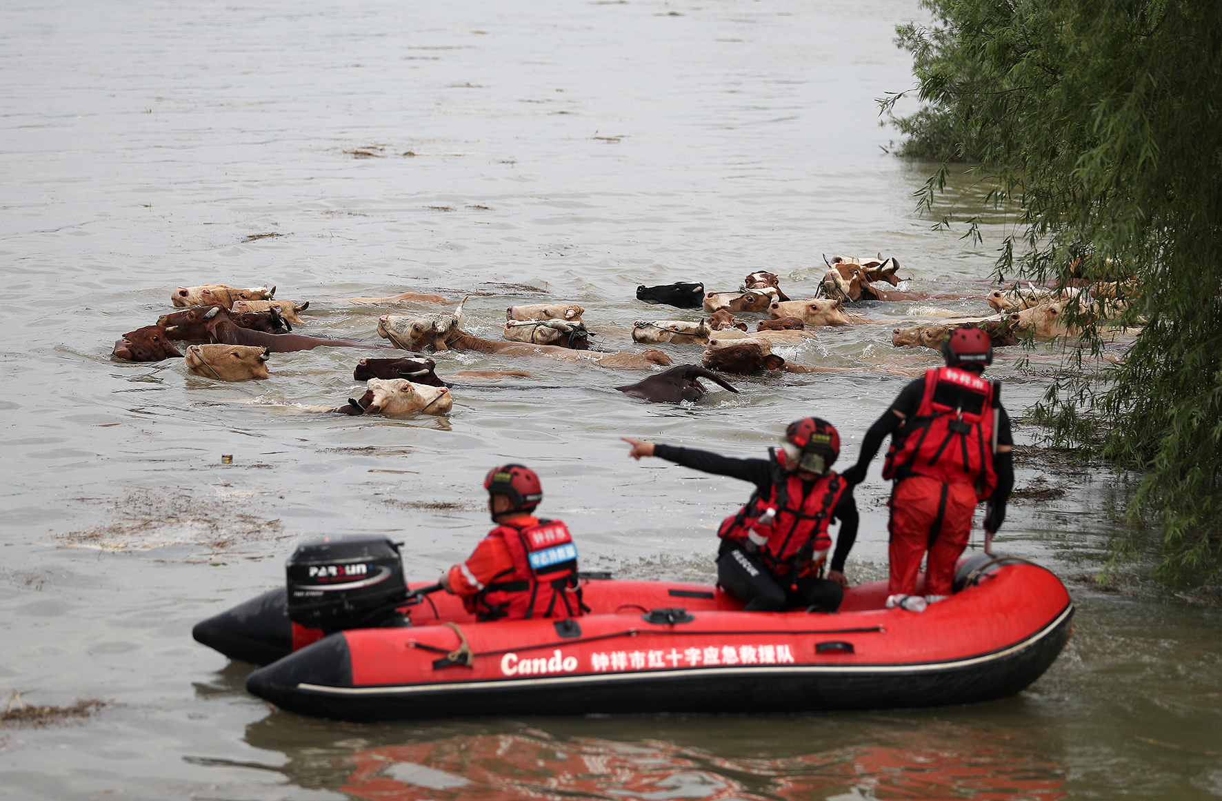 7月15日,受降雨及上游泄洪影响,汉江湖北省钟祥柴湖段水位持续上涨,钟祥市柴湖镇中心集村村民肖春华散养在汉江江滩的42头黄牛被江水围困,随时有被大水冲走的危险。危急时刻,钟祥市公安局迅速组织柴湖派出所、中志协应急救援队、莫愁义警赶往现场实施救援。救援人员通过皮划艇后方驱赶、前方涉水引导等方式将被围困的牛群全部成功营救上岸。