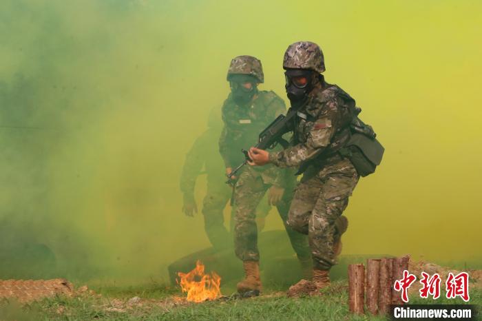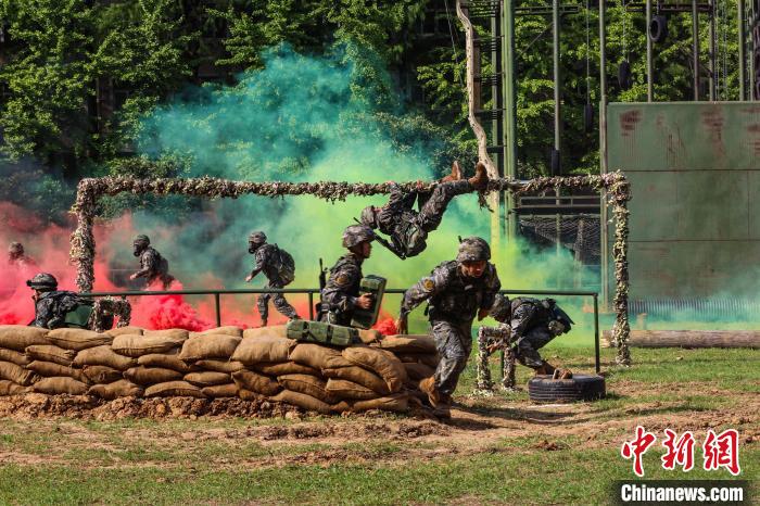 近日,武警湖北总队某部开展战斗体能课目示范演示。穿越障碍区、协作攀登、通过染毒地带、搬运伤员……现场构设沉浸式实战化训练场景,硝烟弥漫,“战”味十足。图为武警官兵开展战斗体能综合演练。徐森林摄