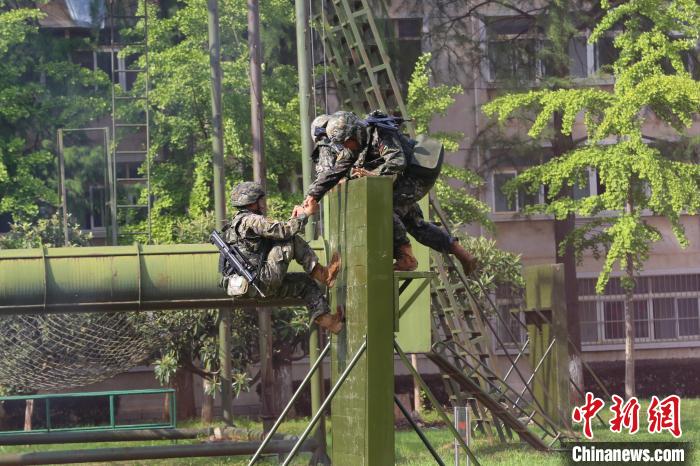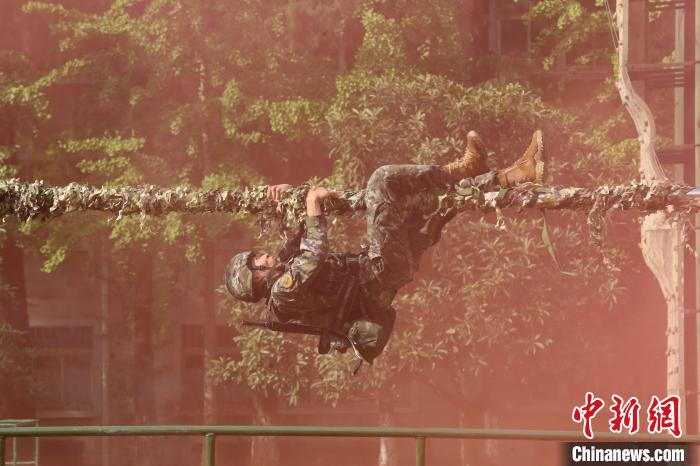 近日,武警湖北总队某部开展战斗体能课目示范演示。穿越障碍区、协作攀登、通过染毒地带、搬运伤员……现场构设沉浸式实战化训练场景,硝烟弥漫,“战”味十足。图为武警官兵开展小组协同逾越高墙训练。饶博文 摄