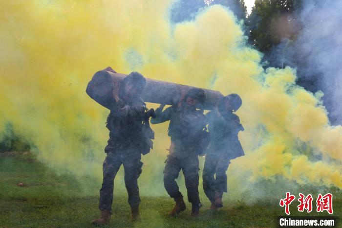 近日,武警湖北总队某部开展战斗体能课目示范演示。穿越障碍区、协作攀登、通过染毒地带、搬运伤员……现场构设沉浸式实战化训练场景,硝烟弥漫,“战”味十足。图为武警官兵开展小组协同搬运重型物资训练。饶博文摄