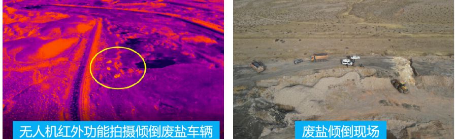 2022年11月17日,乌海市生态环境局海南区分局(下称海南生态环境局)值班人员接到12345平台推送的群众举报案件,称有人在西水地区闻到浓烈的化工异味,疑似偷排偷倒。西水地区地广人稀,执法人员利用无人机红外功能高空侦查,锁定河槽内几辆可疑货运汽车。为了不被偷倒者察觉,执法人员关闭光源,在无人机指引下迅速靠近,发现3辆双桥货车、1辆铲车以及驾驶人员4人,现场已经倾倒疑似废盐的物质约200吨,伴有强烈的刺激性气味。