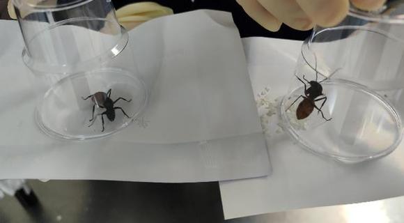 日前,江西南昌昌北机场海关在对进境邮件开展监管时发现,一票申报为“食品”的邮件包裹机检图像异常。经开拆彻查,发现在包裹中食品袋内夹藏三支黑色试管,每支试管各装有1只长约5厘米的大型活体蚂蚁,头胸部黑色,腹部红棕色,活动性很强。11月5日经专业机构鉴定,3只“异宠”蚂蚁为巨人恐蚁。