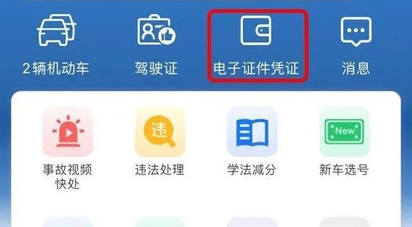 登录“交管12123”App,点击首页“电子证件凭证”功能,进入“电子证件”子功能,点击下方列表项即可显示电子行驶证。
