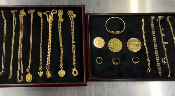 经进一步查验,海关关员在其行李箱内查获一个红色饰品袋,内有超量携带的疑似黄金制品22件,共计405.7克,总价约23万元。经专业机构鉴定,上述物品均为含量超99.9%足金制品。