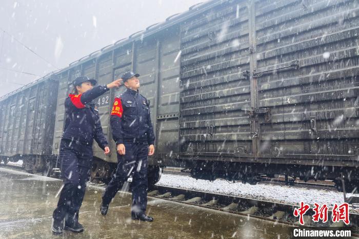 图为民警对停靠货运列车进行安全巡查。张鑫 摄