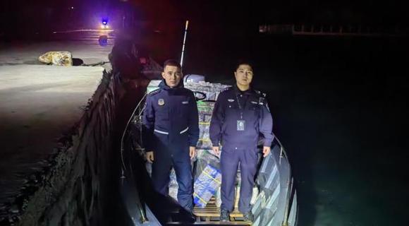 2月6日22时许,该局防城工作站执法艇在万欧海域附近巡逻时,发现1艘关闭航行灯的摩托艇,船舱内搭载大量灰色编织袋货物,形迹可疑。海警执法员立刻向其靠近,喊话要求停船接受检查,该摩托艇拒不停船且加速逃窜,经过10余分钟追缉,嫌疑人发现逃窜无果后便冲滩弃船逃跑。经检查,该艘摩托艇舱内装载疑似中华、南京、黄鹤楼等品牌香烟60件,现场未发现该批香烟的合法来源手续,涉嫌走私。