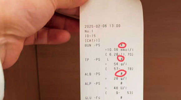 一位宠物主人提供的生化检查单,画圈处为生化试剂过期警示符号。受访者供图