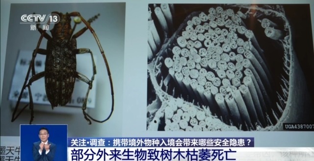 总台央视记者 叶奂:在宁波海关国门生物安全展示馆里,展示着宁波口岸截获的各类外来生物标本。有种植物叫刺苍耳,原产于南美洲,它是一种典型的外来恶性杂草,全身带刺,它的刺容易对人和动物造成物理性伤害,而且伤口可能引发感染。在农田生态系统中,它通过迅速繁殖,入侵大豆、蔬菜等农作物,影响农业生产;另外一方面它又表现出极强的竞争性和排它性,挤压其他植物的生存空间,从而导致生物多样性的下降。