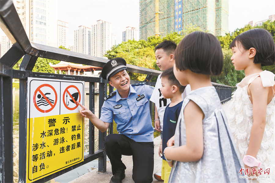 7月13日,福建省晋江市公安局梅岭派出所民警在辖区公园向小朋友宣传防溺水知识。张金坛 摄