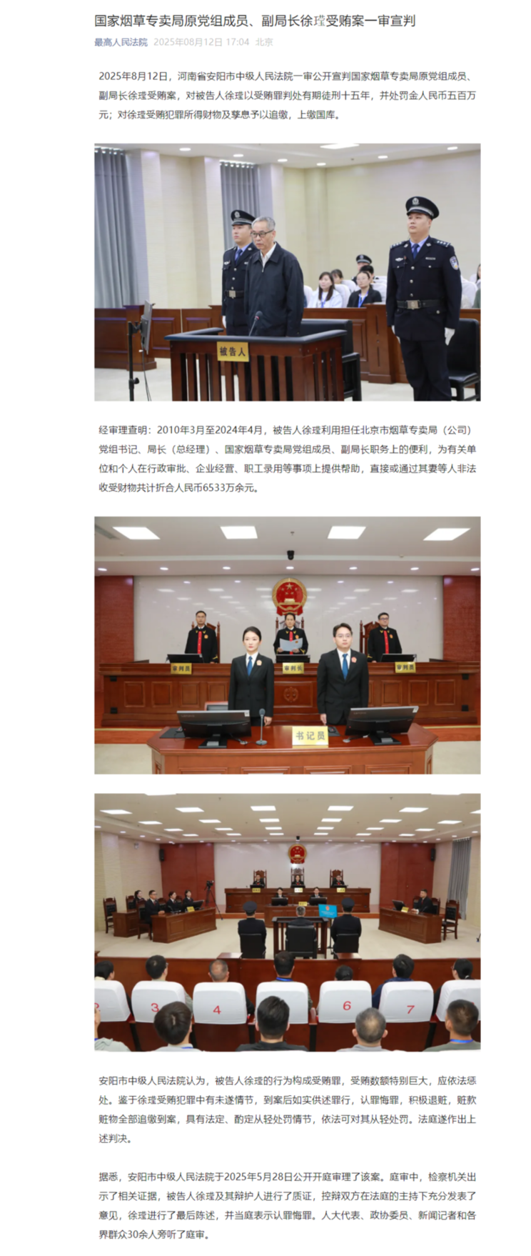 央视网消息:据最高法微信公众号消息,2025年8月12日,国家烟草专卖局原党组成员、副局长受贿案一审宣判。