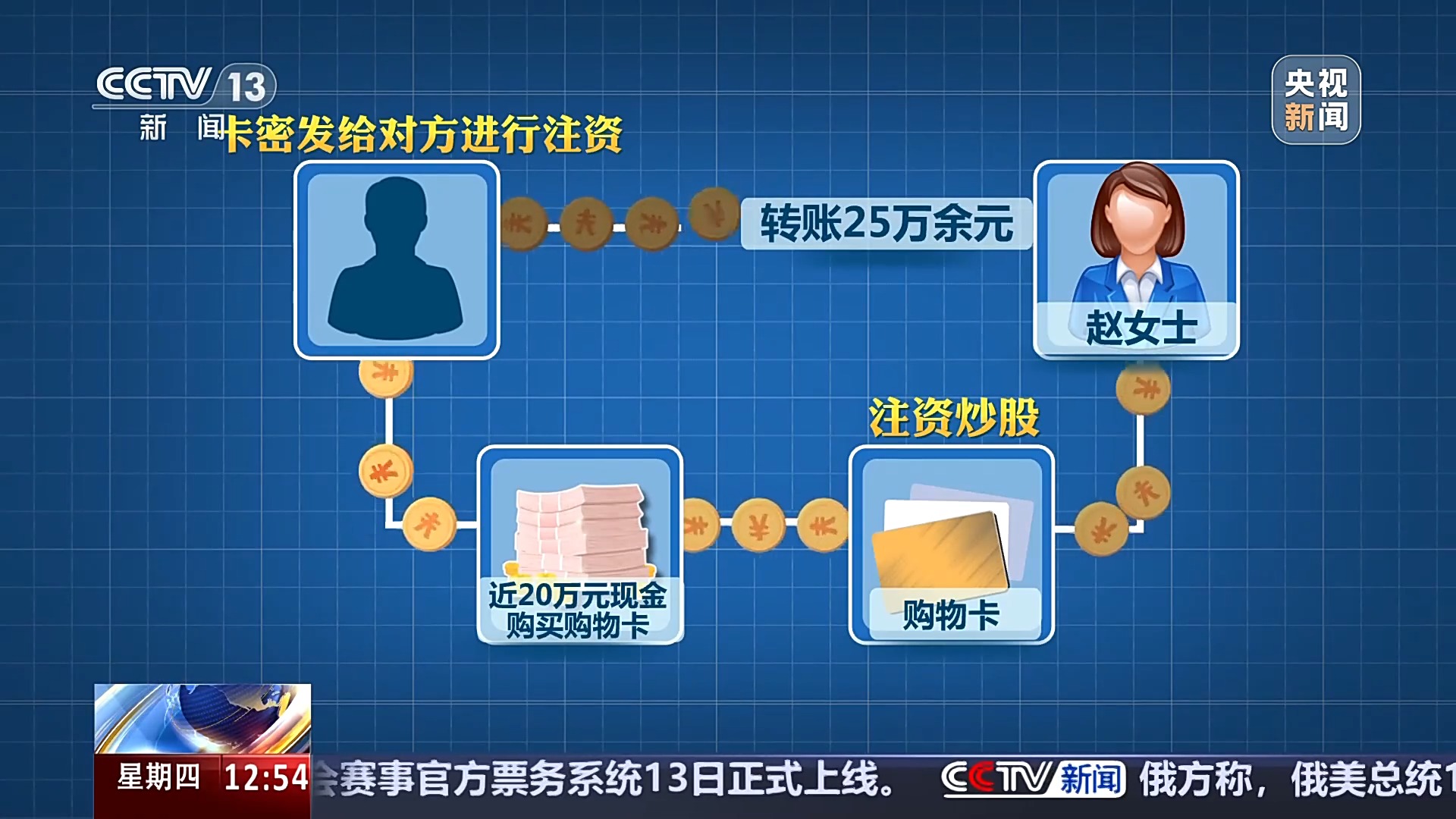 在这个过程中,为了展示自己的“诚意”,也为了让赵女士看到自己真有投资的“本事”,对方主动给赵女士转账25万余元,让赵女士取出现金买成购物卡注资炒股,两人一起赚钱。看对方如此信任自己,再加上账户中不断增长的收益,赵女士心动了,陆续取出近20万元积蓄,购买超市购物卡,将卡密发给对方进行注资。