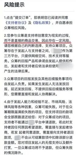 2023年7月,某科技公司在某点平台发起“新国标电动自行车”的众筹项目,目标金额为698 000元,支持者可通过支付6980元参加该项目众筹,回报为“某品牌电动自行车”。众筹项目页面展示了商品的外观,“众筹回报”处载明“本次众筹车款仅需6980元即可拥有,所见即所得,全国均可上牌上路,为潮流出行圆梦”;“公司简介”处载明“本次众筹活动的车款按照国家要求进行整车质检及3C认证申报,是新国标范围内可合法上牌上路的改装车款”;“风险提示”处载明“您参与众筹是支持将创意变为现实的过程,而不是直接的商品交易,由于发起人能力和经验不足、市场风险、法律风险等各种因素,众筹可能失败……”
