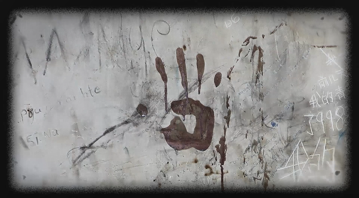 图为徐发启犯罪集团关押电诈人员的小黑屋内,墙上留下的血手印。(公安部供图)