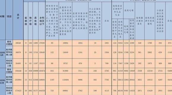 从查处问题类型看,在履职尽责、服务经济社会发展和生态环境保护方面不担当、不作为、乱作为、假作为,严重影响高质量发展方面,9月共查处问题10984起,占当月查处的形式主义、官僚主义问题总数的82.9%。9月查处的违规收送名贵特产和礼品礼金、违规吃喝、违规发放津补贴或福利3类问题,分别占当月查处的享乐主义、奢靡之风问题总数的55.1%、22.9%、11.6%。