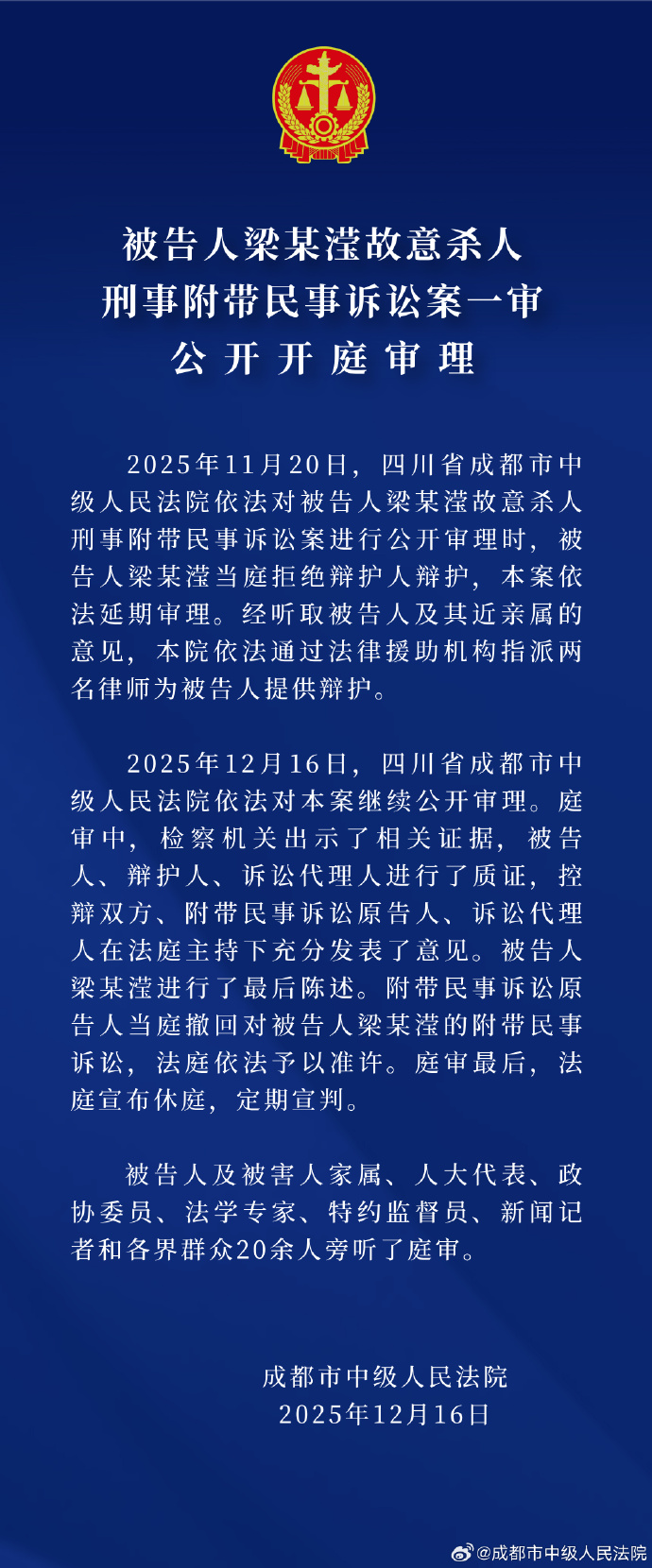 12月16日,成都市中级人民法院依法对本案继续公开审理。庭审中,检察机关出示了相关证据,被告人、辩护人、诉讼代理人进行了质证,控辩双方、附带民事诉讼原告人、诉讼代理人在法庭主持下充分发表了意见。被告人梁某滢进行了最后陈述。附带民事诉讼原告人当庭撤回对被告人梁某滢的附带民事诉讼,法庭依法予以准许。庭审最后,法庭宣布休庭,定期宣判。