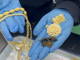 广州海关所属广州邮局海关关员在对一批进境邮件进行监管时,连续发现8件申报均为“铜制装饰品”的进境邮件机检图像异常。经开箱查验,现场关员发现该批邮件内有数十件手串、项链、戒指等饰品。其中,部分饰品呈淡黄色,表面带有象牙特有的“利兹纹”,疑似象牙制品;另有部分饰品内部有黄褐斑纹,疑似玳瑁制品。