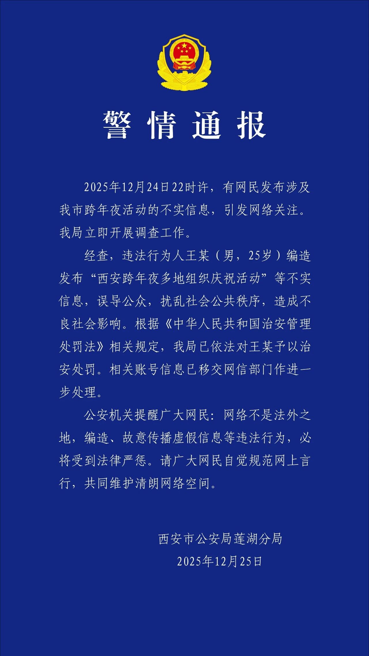 央视网消息:据“西安莲湖公安”微信公众号消息,12月24日22时许,有网民发布涉及西安市跨年夜活动的不实信息,引发网络关注。西安市公安局莲湖分局立即开展调查工作。经查,违法行为人王某(男,25岁)编造发布“西安跨年夜多地组织庆祝活动”等不实信息,误导公众,扰乱社会公共秩序,造成不良社会影响。根据《中华人民共和国治安管理处罚法》相关规定,西安市公安局莲湖分局已依法对王某予以治安处罚。相关账号信息已移交网信部门作进一步处理。