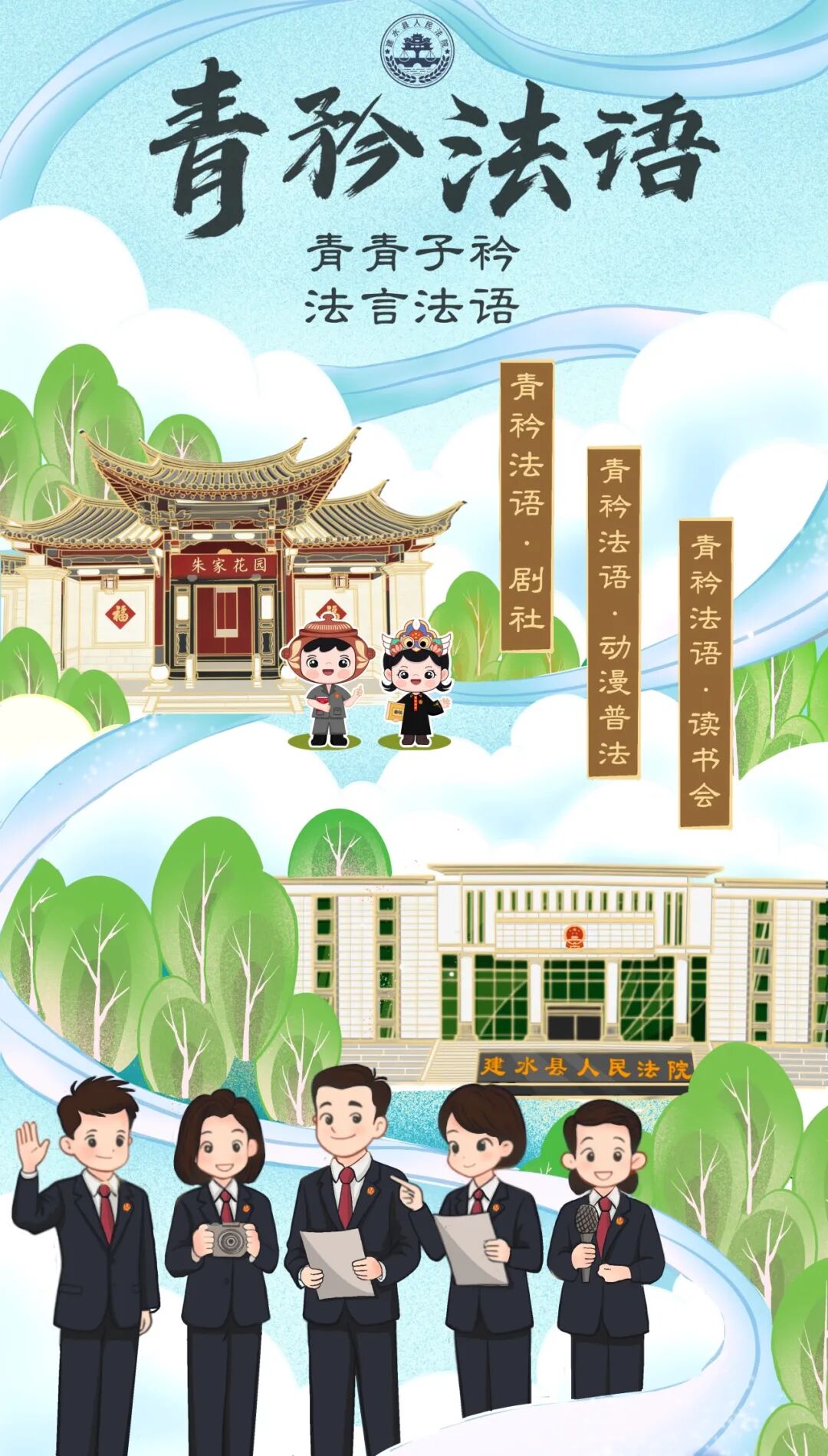 文化如水,润物无声。近年来,建水法院确立了以青年干警为主体的“青衿法语”文化品牌。品牌取自“青青子衿”“法言法语”之意,“青衿”二字指青色衣衿,古代学子所穿,代表年轻学子之志,蕴含“青衿之志,履践致远”之义;“法语”代表专业的法律素养,二者交融,旨在培育德才兼备的新时代法院人才。