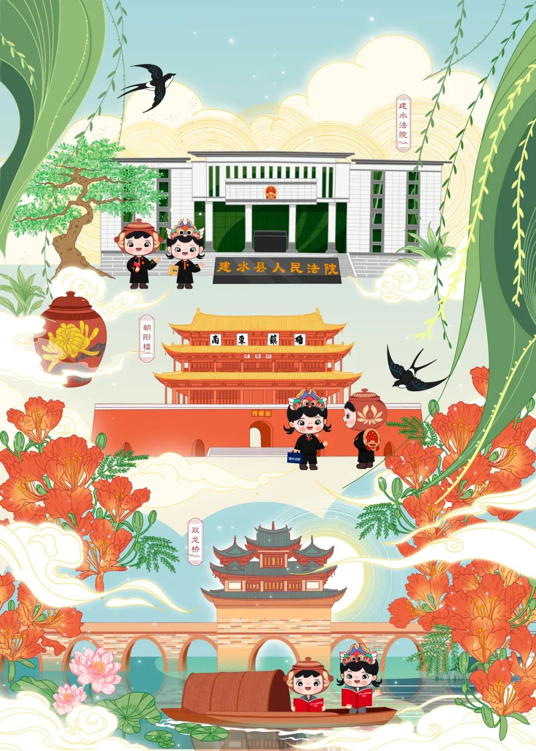 “现在正是万物互联、资讯骤增的时代,受众对视觉设计的要求越来越高,普法宣传不仅要有内容、有意义,也要求形式有趣、吸引人。”基于这样的初衷,建水法院“青衿法语·动漫普法”团队打造“燕燕”“陶陶”原创IP动漫法治品牌, 以生动可爱、活泼酣恣的国画笔触,创作了系列普法漫画和文创作品。