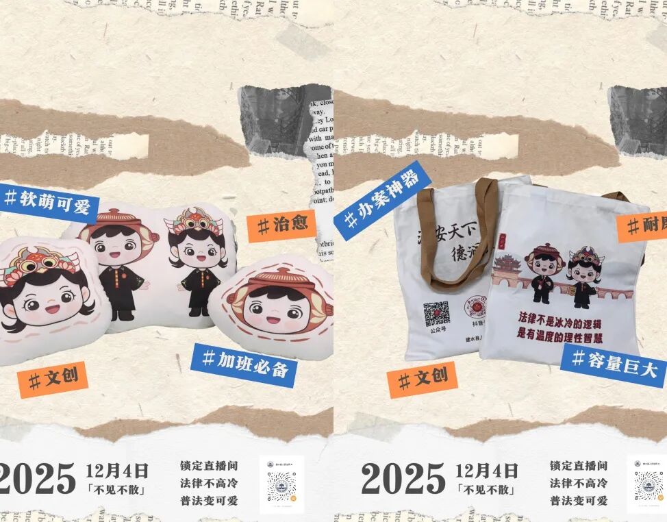 “天有时,地有气,材有美,工有巧,合此四者,然后可以为良。”器物在道,是中国传统美学的至高境界。“青衿法语·动漫普法”团队匠心独运,将建水本地千年古城文化、中华法系智慧与现代法治理念巧妙融合,推出“燕燕”“陶陶”冰箱贴、鼠标垫、帆布包等系列法治文创,化作可触、可感、可伴的灵动周边。在今年国家宪法日来临之际,“青衿法语·动漫普法”团队携法治文创产品参加由人民法院传媒总社、最高人民法院新闻局主办的“筑牢法治信仰守护美好生活”法治文创市集直播。云南建水——浙江南浔,一场跨越山海的“法治美学”开启,在“燕燕”“陶陶”的文创小摊每一件产品都藏着法院人的初心与巧思——从办案日常到调解温情,从法治理想到生活美学, 让法律不再高冷,让普法可亲可敬可感,原来,法治也可以这么“潮”。