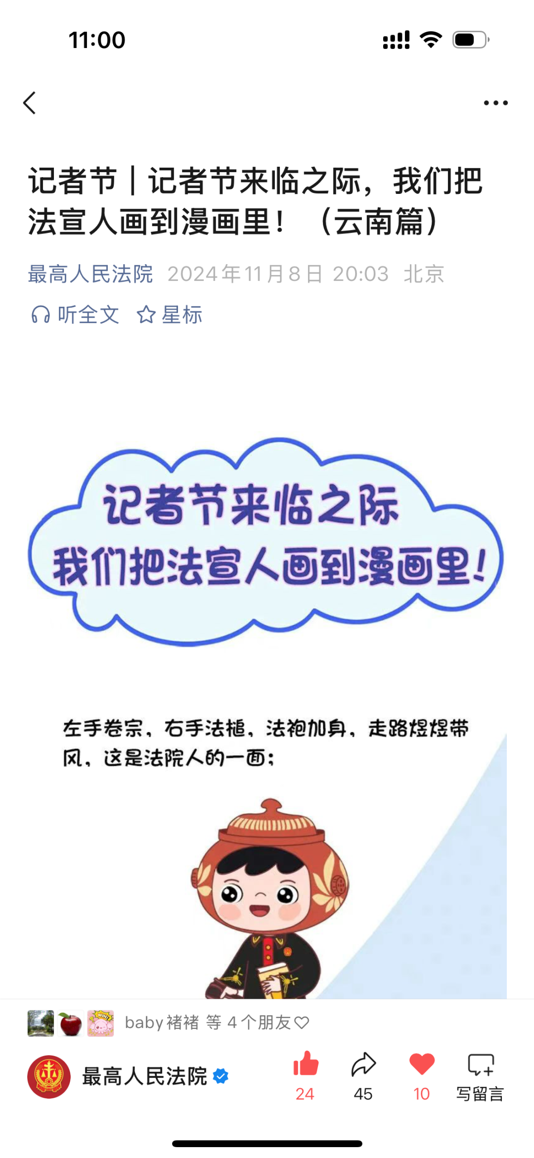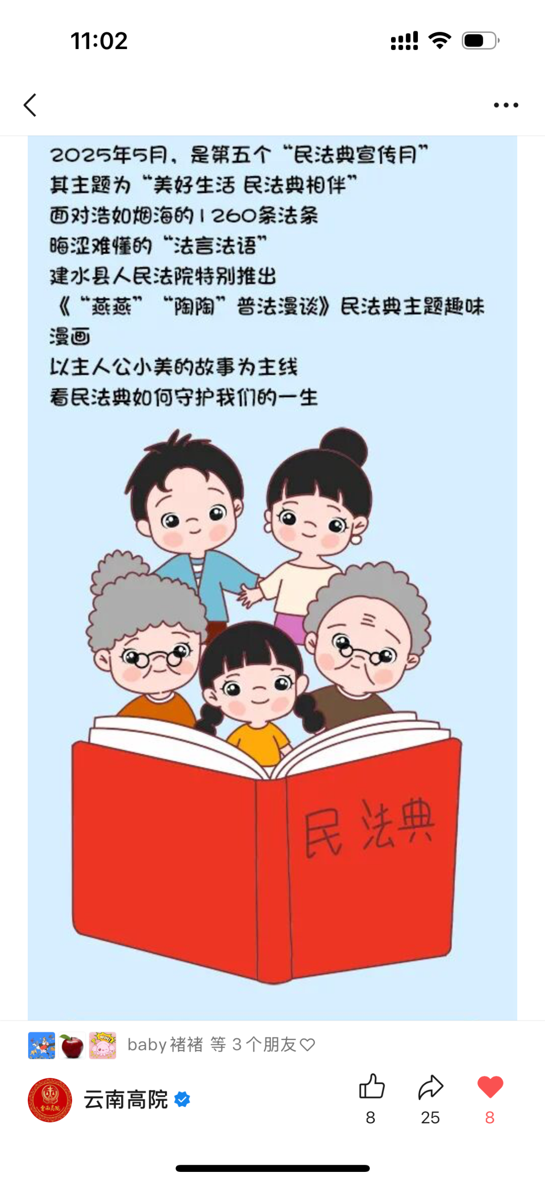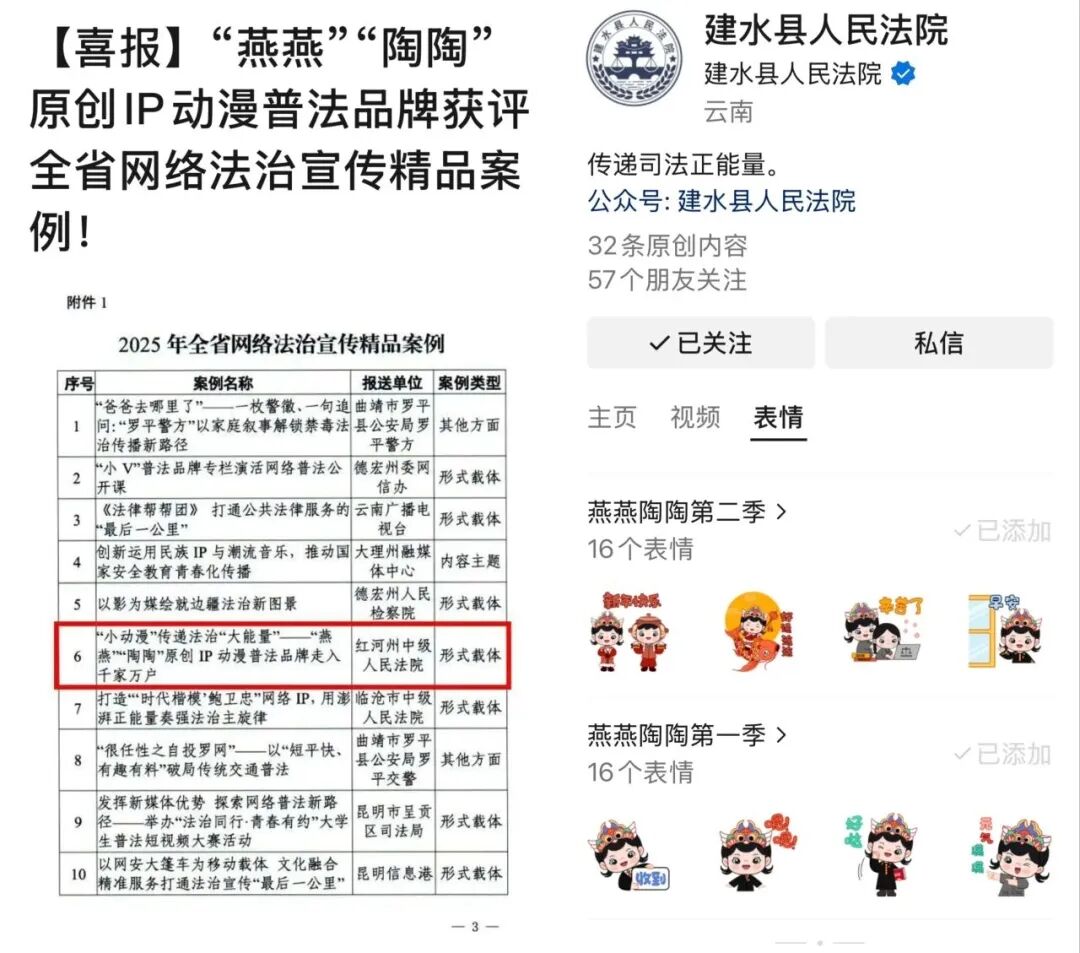 文化的厚度赋予法治以力度、温度。从法官IP到系列漫画,从趣味互动到文创周边,承载着法治精神的“燕燕”“陶陶”跃然屏上,“青衿法语·动漫普法”团队以原创IP为纽带,让法治精神真正“活”入生活里、“暖”在陪伴中、“根”系文化间,构建出一个有温度、有记忆、有生命的法治宣传新生态。今年11月,由红河州中级人民法院指导报送的《“小动漫”传递法治“大能量”——建水法院“燕燕”“陶陶”原创动漫普法品牌的“破圈”之路》获评云南省网络法治精品案例。