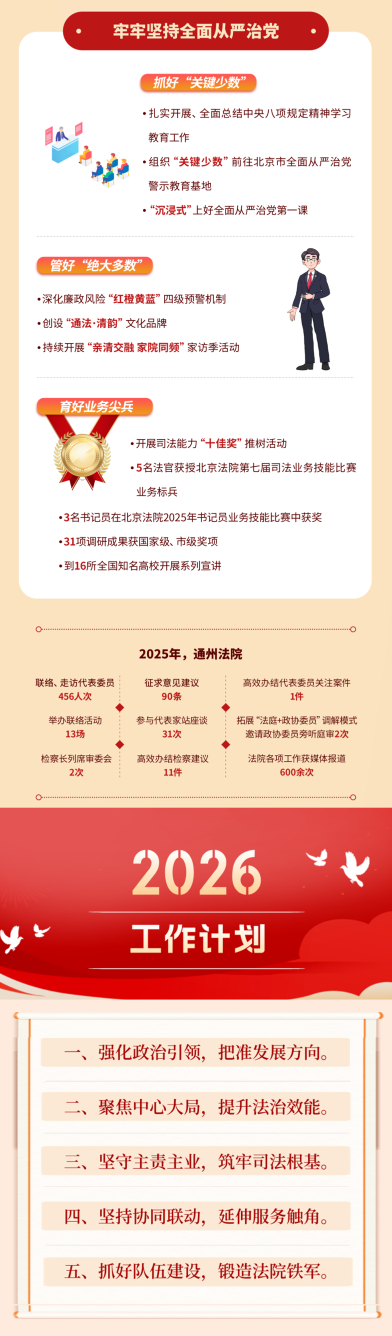 报告中,谭劲松院长围绕“牢牢坚持党的绝对领导,以党建引领‘两个融合’巩固模范机关建设成效”“牢牢坚持为大局服务,以高度政治责任感全力支撑和服务副中心高质量发展”“牢牢坚持公正司法核心,以审执质效全面提升筑牢司法公信力根基”“牢牢坚持和发展新时代‘枫桥经验’,助力构建矛盾纠纷预防化解新格局”“牢牢坚持全面从严治党,以梯队建设锻造高素质过硬法院队伍”五个方面,全面回顾了通州法院2025年的工作情况。