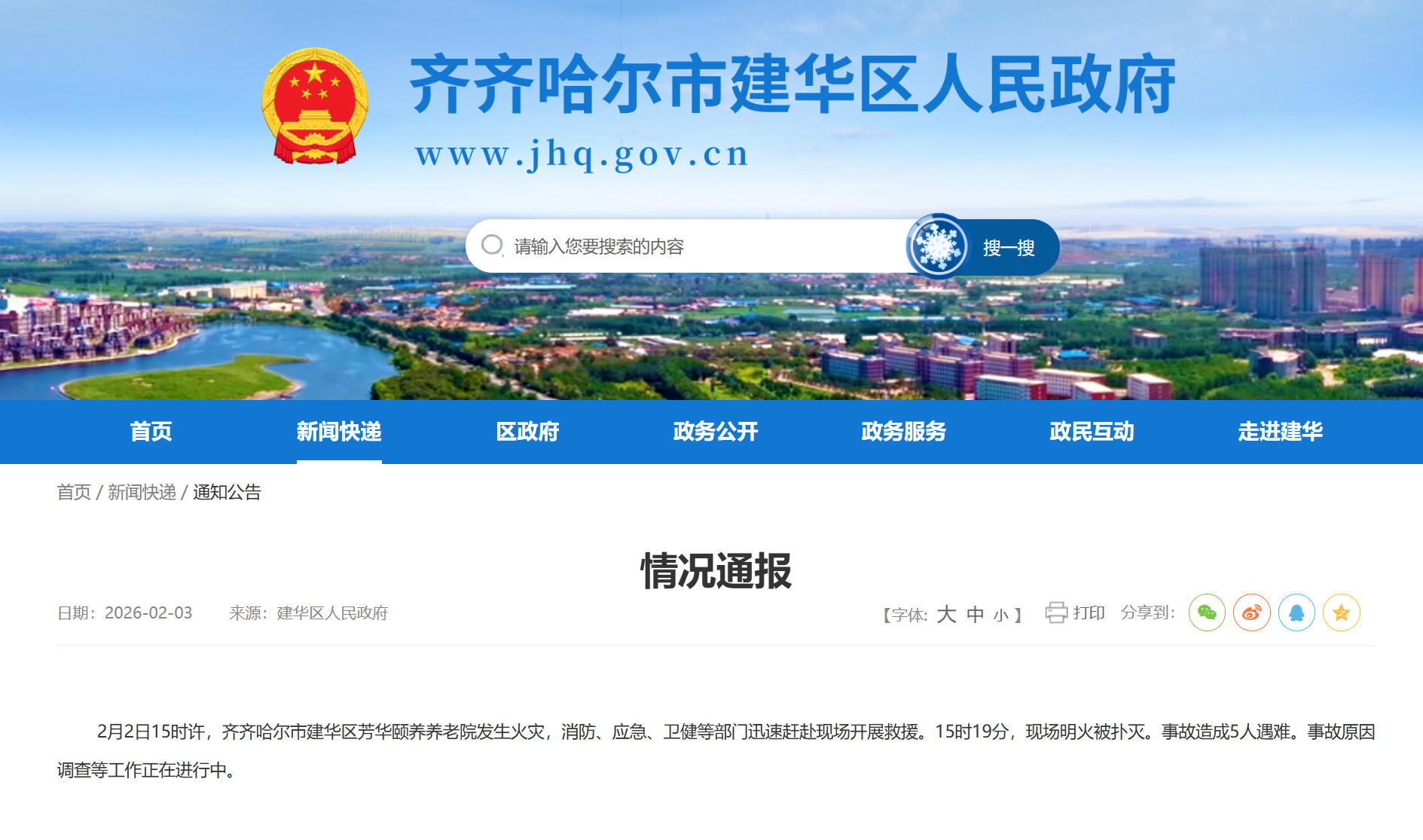 中新网2月3日电 齐齐哈尔市建华区人民政府2月3日发布通报称,2月2日15时许,齐齐哈尔市建华区芳华颐养养老院发生火灾,消防、应急、卫健等部门迅速赶赴现场开展救援。15时19分,现场明火被扑灭。事故造成5人遇难。事故原因调查等工作正在进行中。